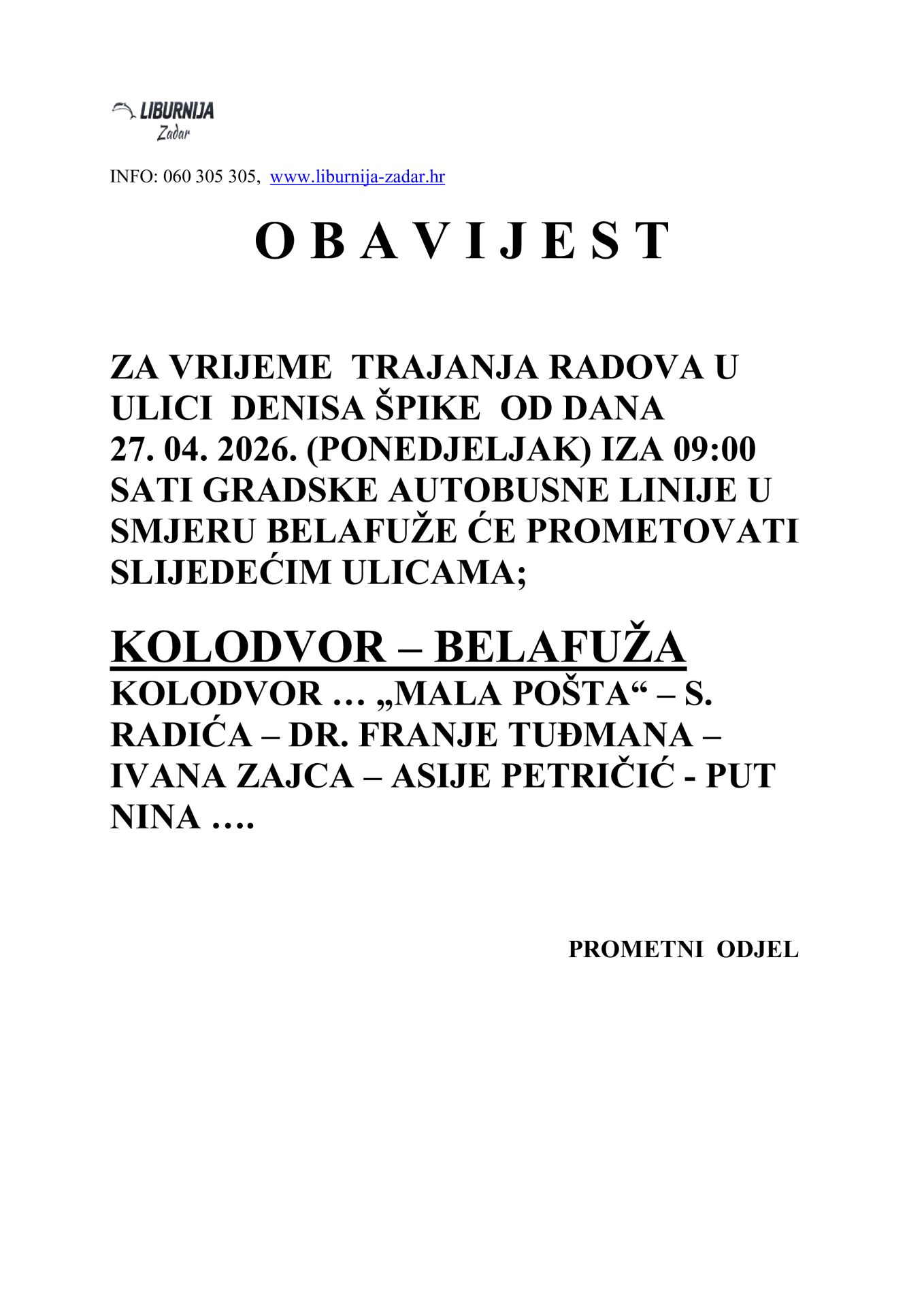 Obavijest za autobusnu liniju Belafuža