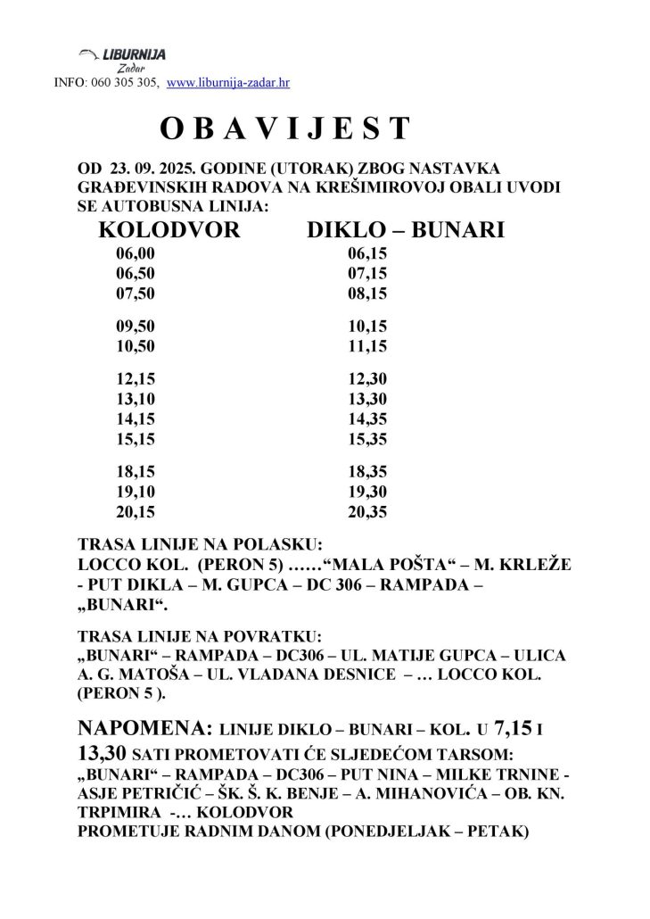 Autobusni kolodvor Zadar: 05:30 – 22:00